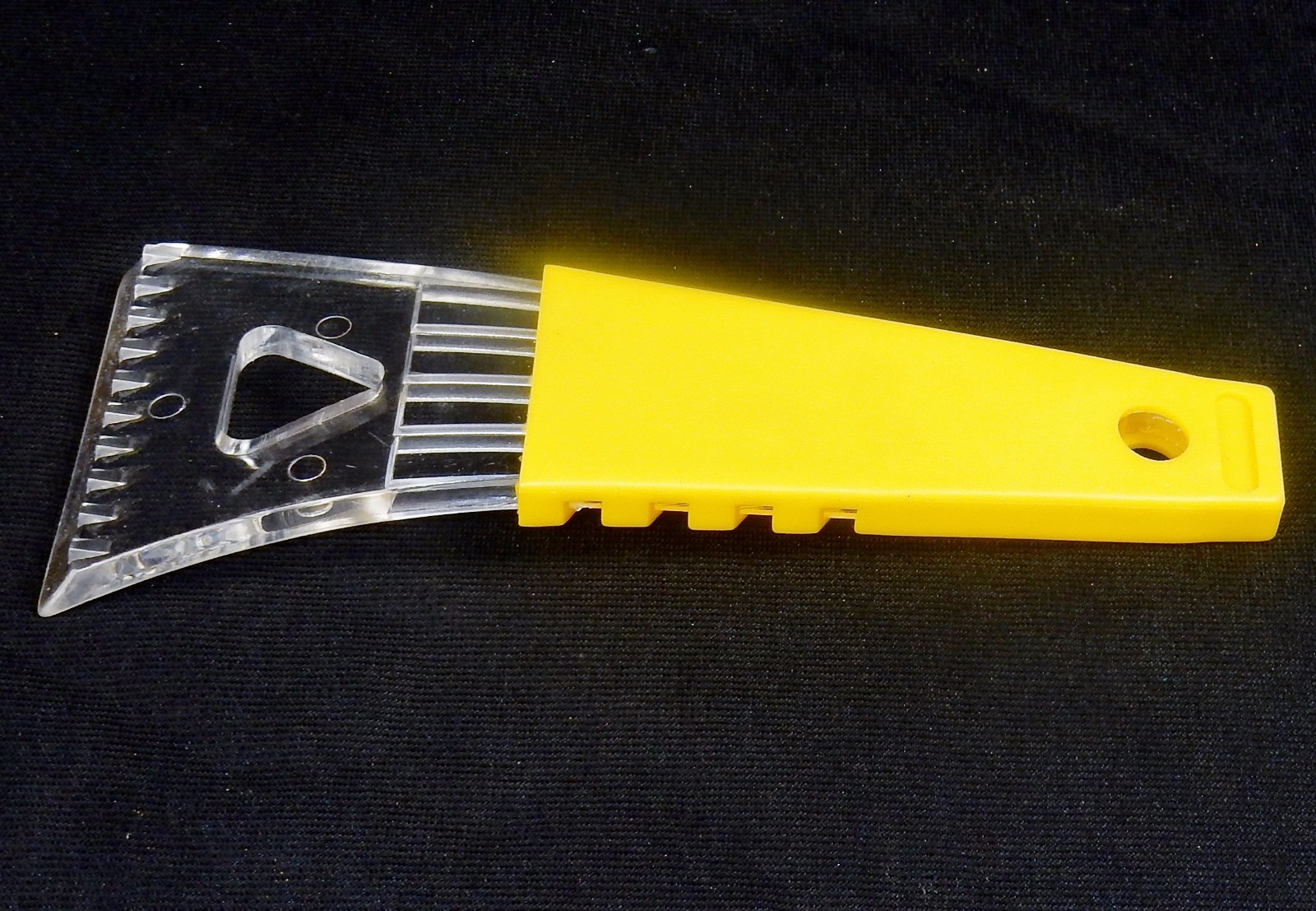 ICE SCRAPER BACKGROUND OF THE INVENTION This invention relates to scrapers, and more particu larly to an improved, hand-held scraper for removing ice and snow from windshields and the like. Recently, hand-held ice scrapers made of a flat, single piece of polymeric material such as polymethacrylate have become widely available.  ... Fetch Doc